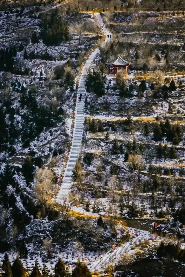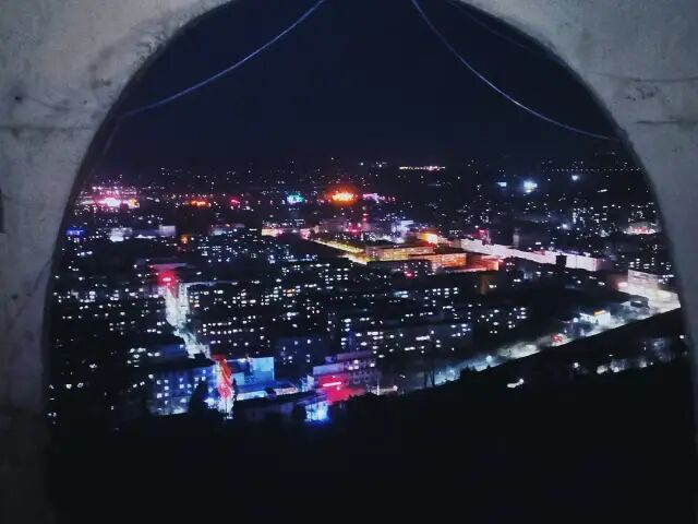 春天去城南的山上,在庙宇的门洞里向下瞭望。灯火璀璨。