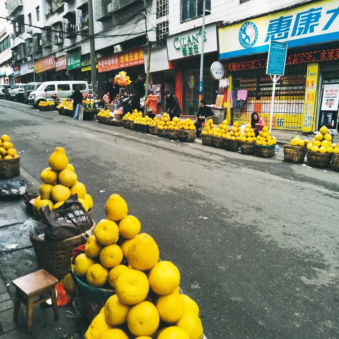 这种满街黄登登的堆小山卖柚子方式真赏心悦目呀!