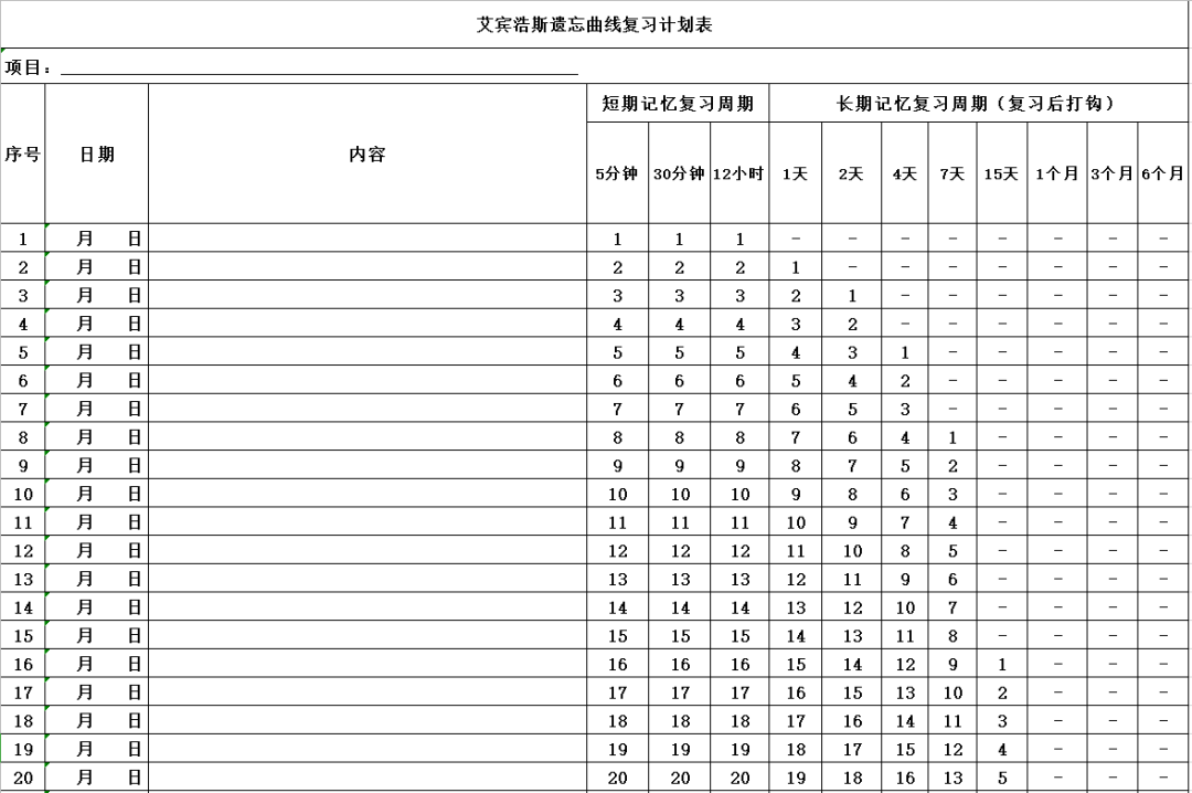大家可以用艾宾浩斯遗忘曲线复习计划表来对自己记忆的项目进行记录,经过科学验证的,大家不妨试试,不管怎么样贵在坚持!