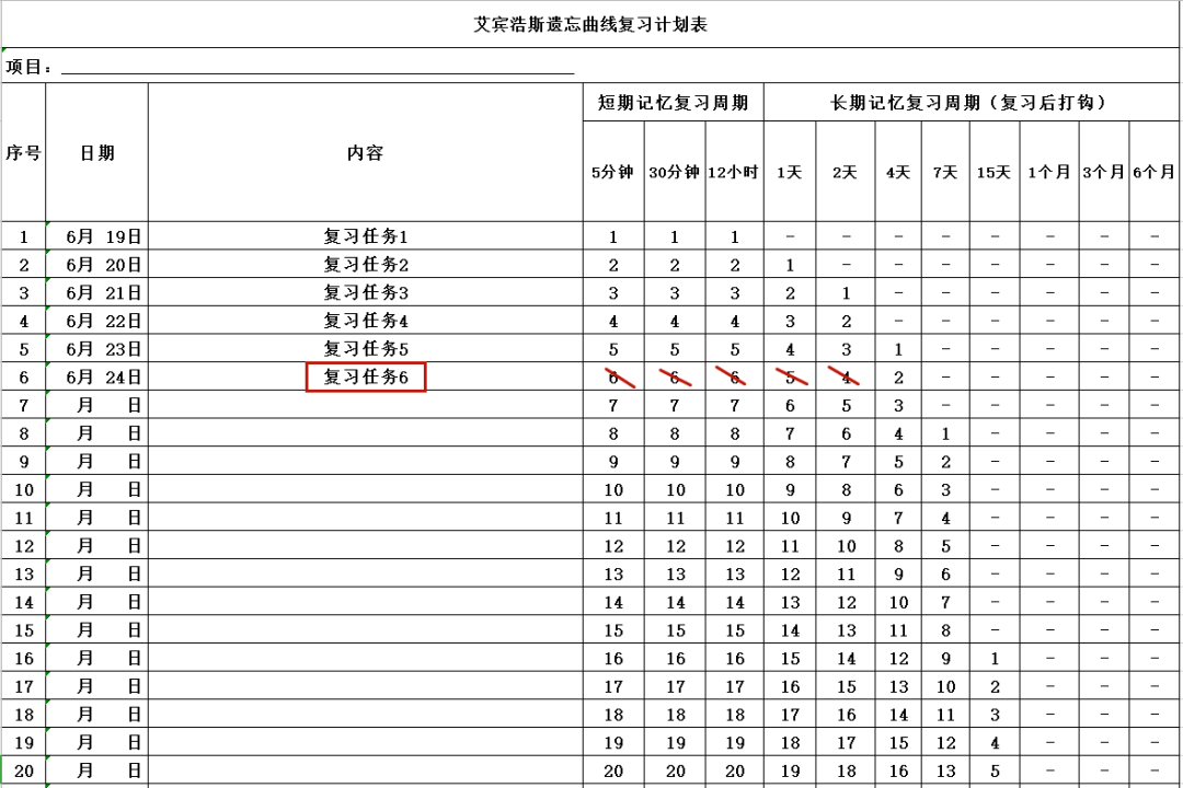 每次完成复习后,将复习周期内的日期划掉,表示这个内容已完成。