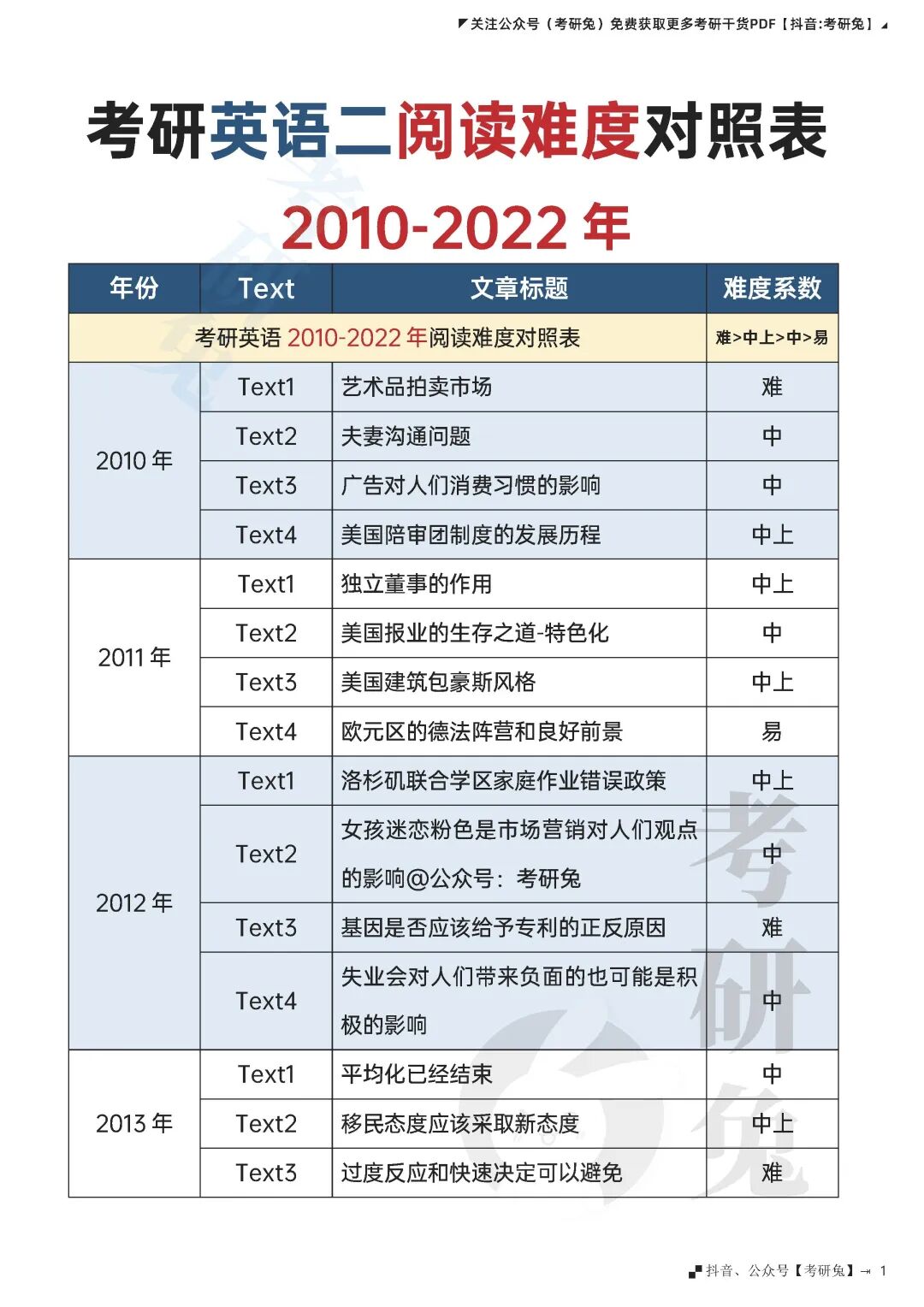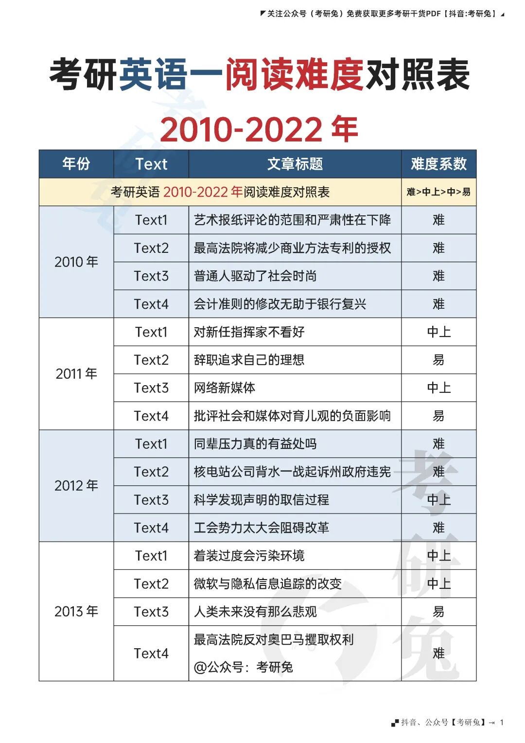 考研英语 | 阅读历年难易对照表!