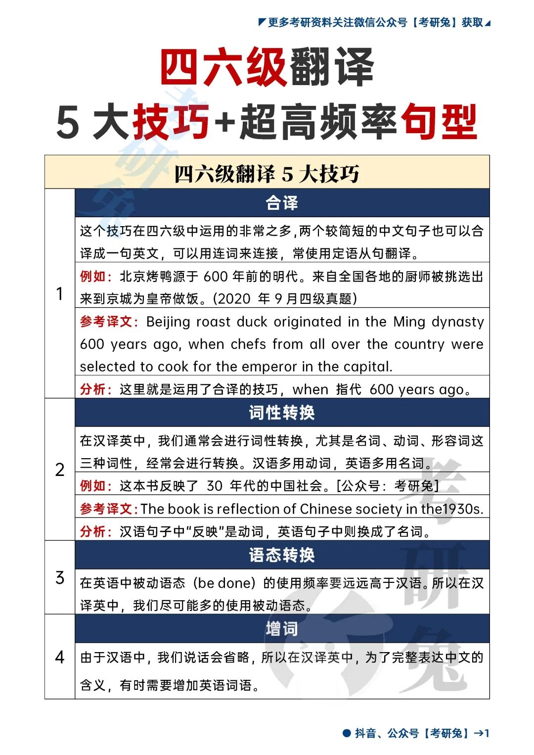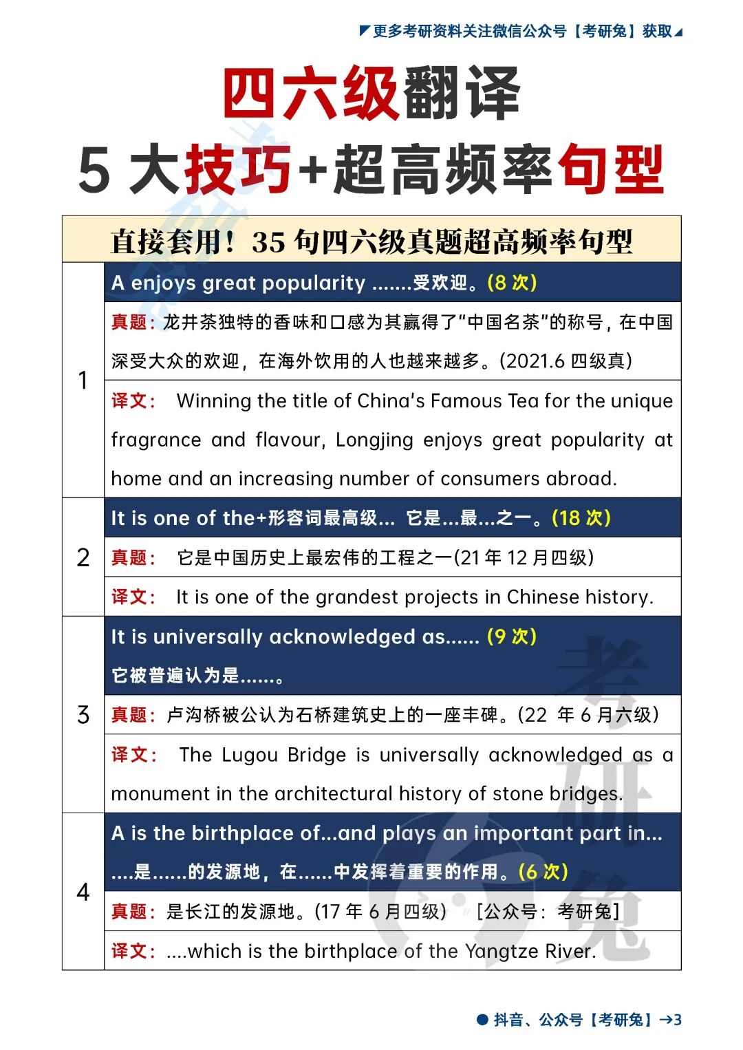 【四六级5大翻译技巧+35句高频句型!直接套用!】