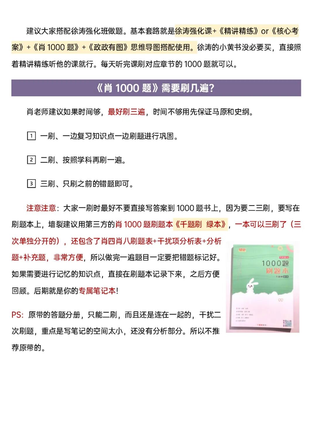 关于如何刷1000题,肖老本人给出的建议是:政治《1000题》最好是做三遍:第一遍是看一章《精讲精练》做一章《1000题》;第二遍是几章或者一个学科(比如马原、史纲、毛中特等)一起做;第三遍是只做之前做错的题目。