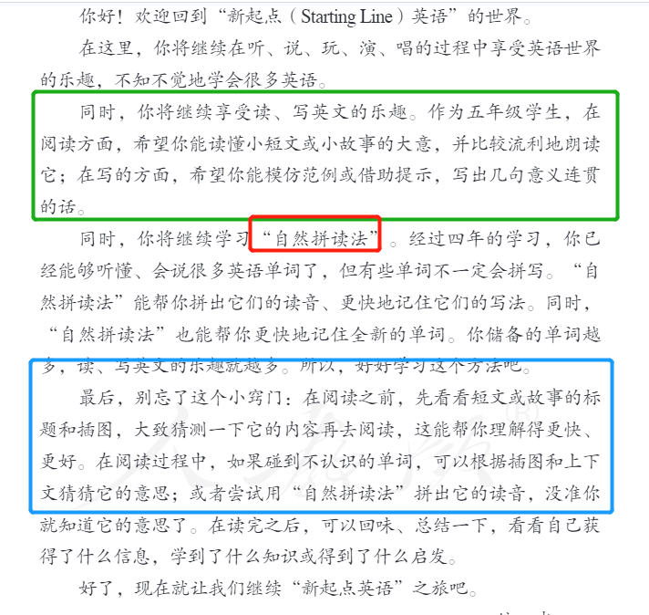 五年级:读懂并朗读短文和故事、模仿写几句话、自然拼读。