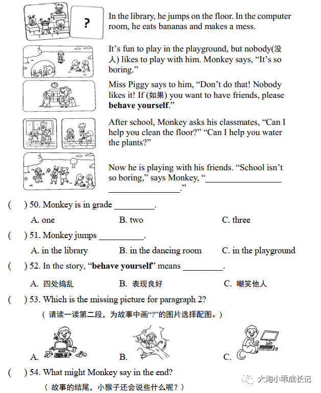 其中的Behave yourself就是考察文章整体理解情况。考完试以后,家长们在一起聊,有一个同学经常背单词,还上过单词训练营,但是没有坚持读英文绘本,这道题他选错了。