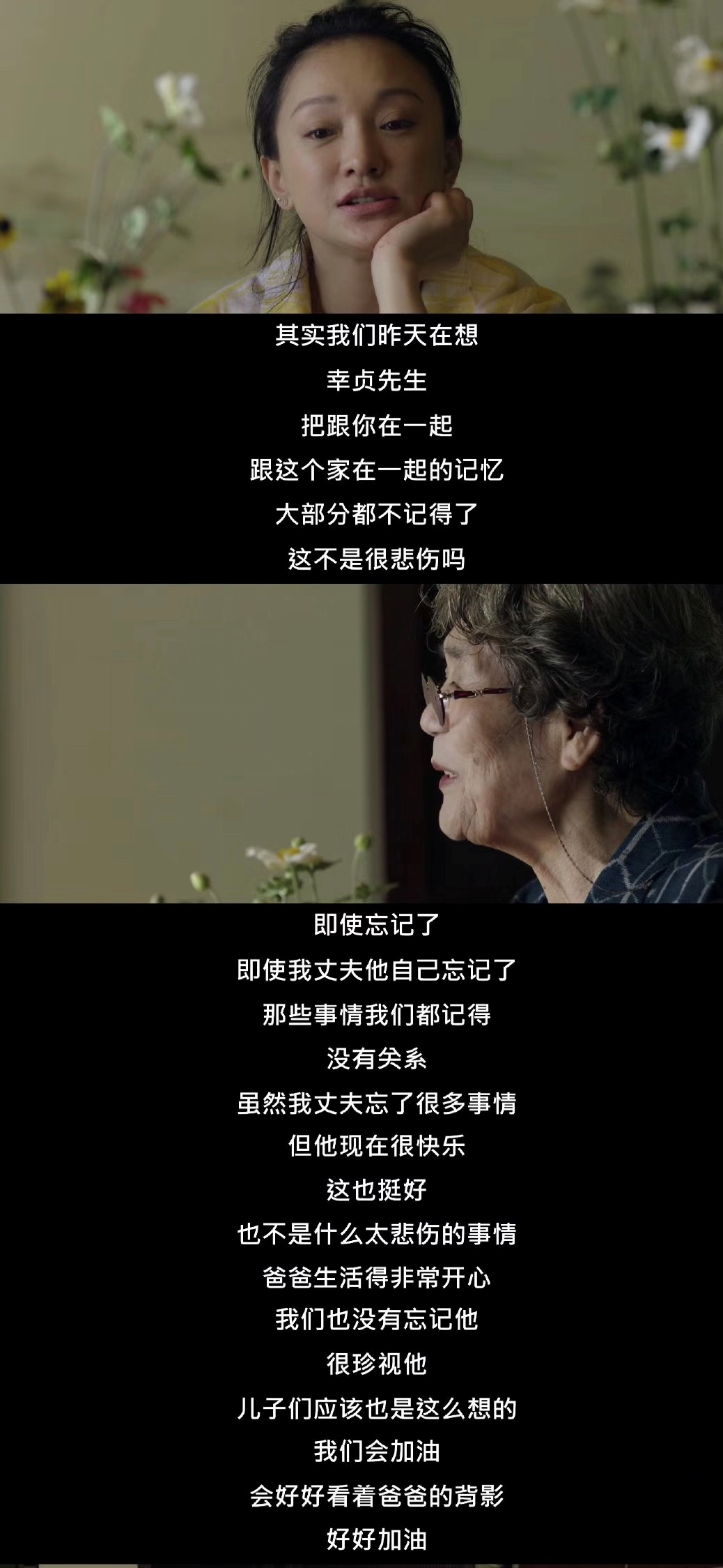 中间他们他们一起去过疗养院探访道子的丈夫,然而丈夫已经是时而认不出道子,时而又能喊出她的名字。讲话已经不清晰的他,最后还唱了一首当年道子最喜欢听的歌。