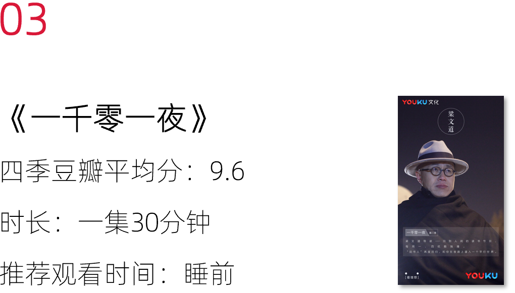 主持人是我们熟悉的梁文道,他想用1001个夜晚(每集全程夜间拍摄),以自己的独到视野与人文关怀,体察一本书的多个面向。
