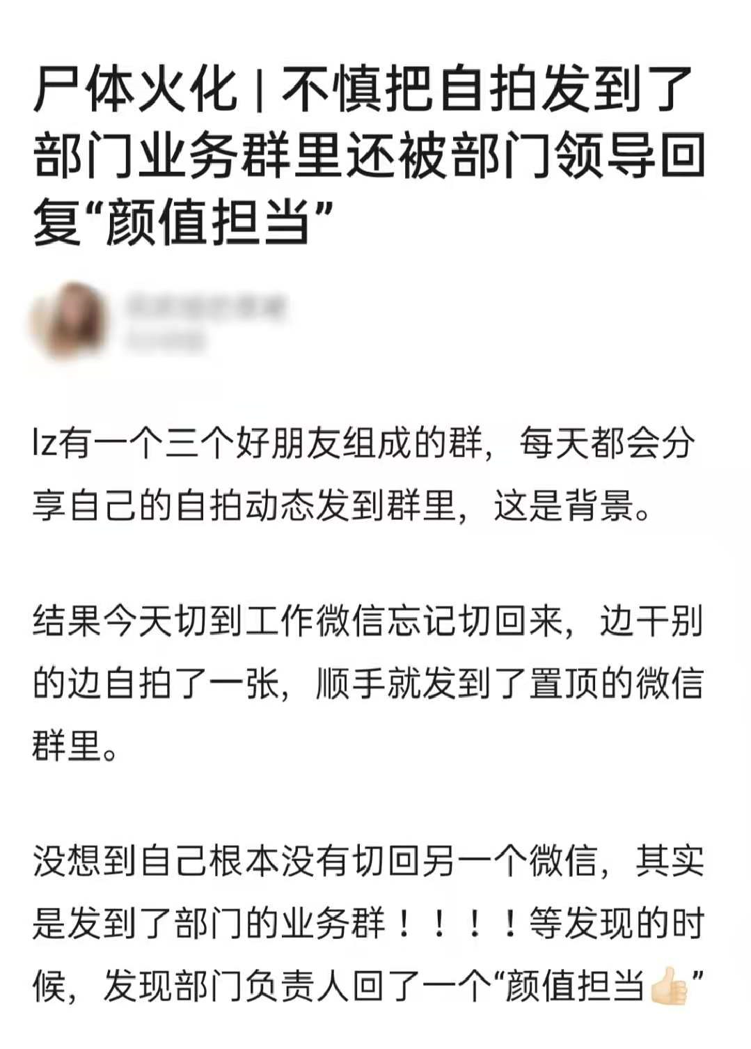 比如我最近刷到的一个社死瞬间是:一位朋友不慎把自拍发到了部门业务群,结果被部门领导回复颜值担当。