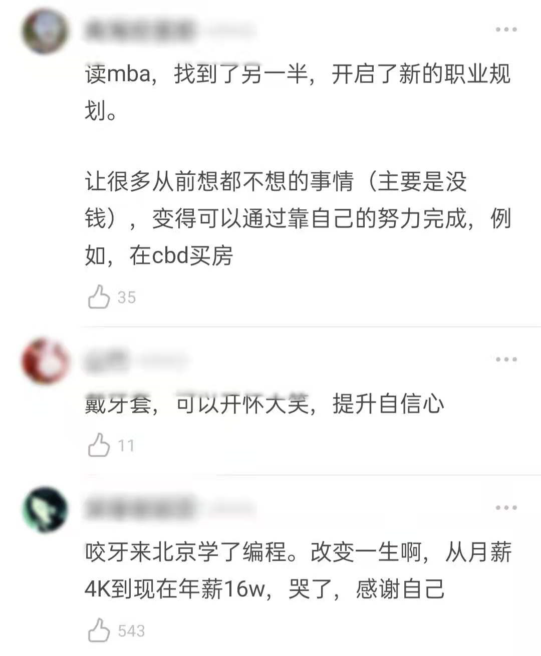 下面留言是「戴了牙套,我终于可以开怀大笑了」、「24岁买了重疾险」、「花了4800培训转行it,庆幸自己的选择」。