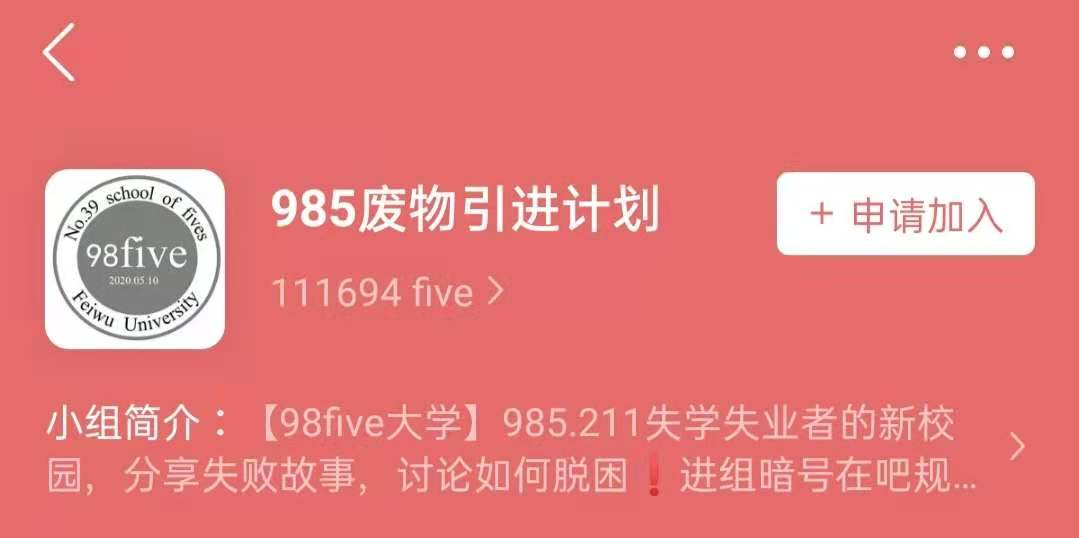组里的11万five(废物的谐音)大都经历相似:他们都曾挤过千万人的独木桥考上顶级名校,却在就读或毕业后感到强烈落差,渴望完成自救。