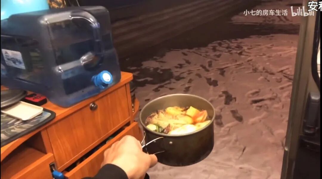 外面是冰天雪地,UP主却敞开车门,在温暖如春的房车里打火锅。