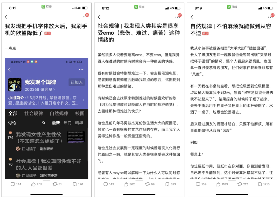 这些“规律”有的很琐碎、接地气,比如"把手机字体调大之后,刷手机的欲望就降低了(一点点)”;有的很深沉,比如“我发现其实人类是很享受emo这种情绪的”,或者“不怕麻烦就能做到从容不迫”。组员们真诚地分享自己的思考,也能收获同伴的热烈讨论,小组中经常能看到点赞、收藏和评论数以千计的帖子。