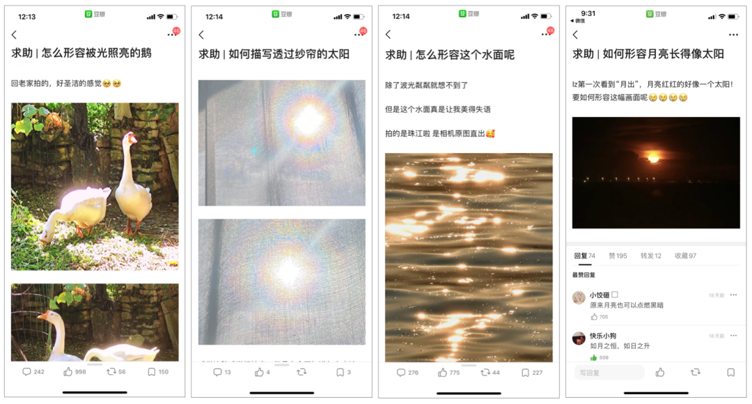 在豆瓣小组,当代年轻人展示出自己质朴的审美——他们并不只喜欢人为制造出来的美好事物,比如精致的服饰、妆容,他们从日月星辰中也能发现美,并为之陶醉。