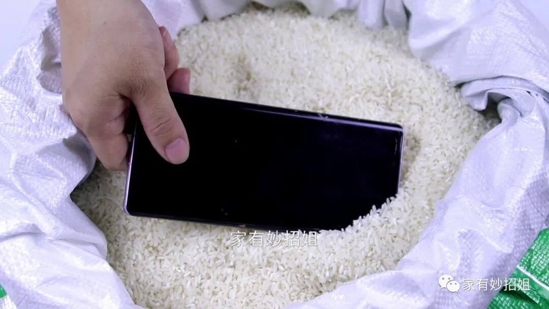 手机表面的水分擦干之后,将手机埋进我们家里的大米里面。