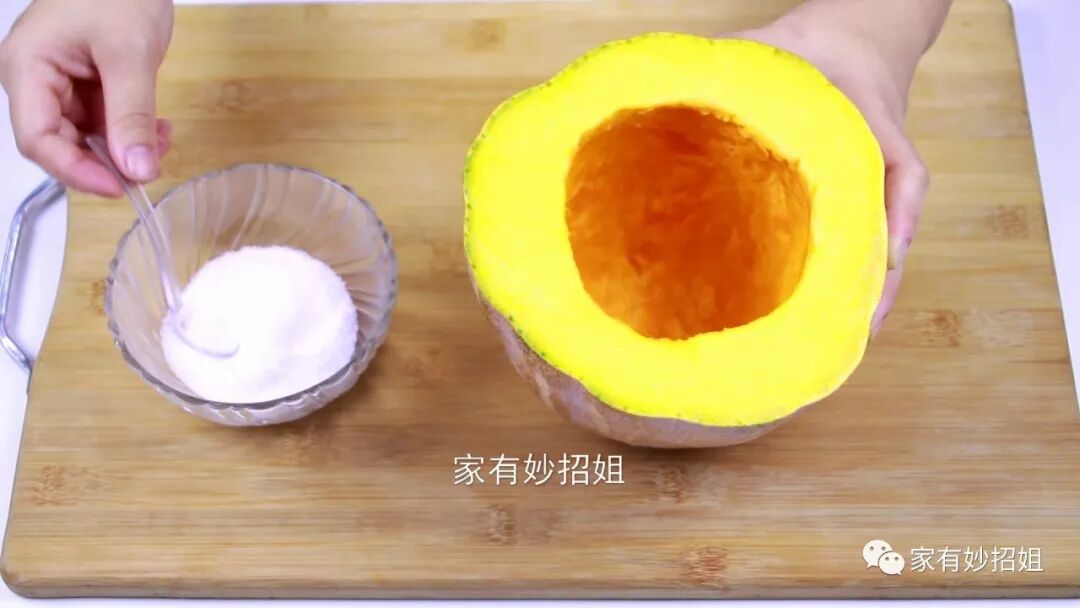 在南瓜的切口处,也会冒出很多的小水珠,我们用纸巾把表面的水分擦干。然后再准备一些食盐,在南瓜的切口处均匀地撒上一层食盐。食盐有杀菌消毒的作用,这样就可以避免南瓜的切口腐烂了。