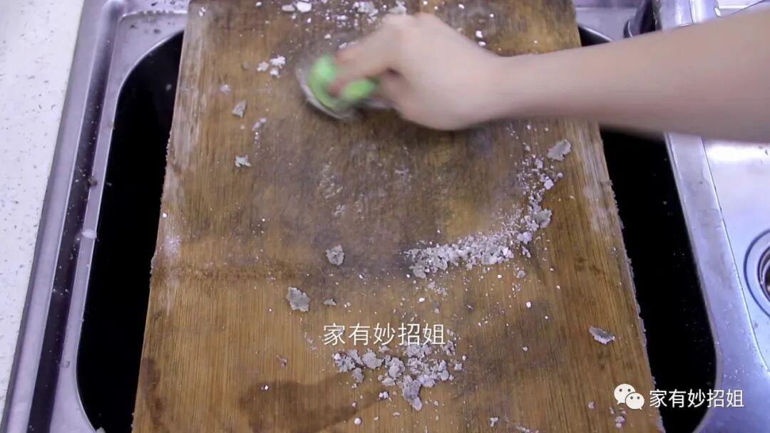 接下来,我们只需要拿上一块百洁布,用百洁布粗糙的一面蘸取小苏打和食盐来擦洗菜板。我们将菜板的角角落落都擦拭过后,就可以看到,菜板明显就已经变干净了很多。