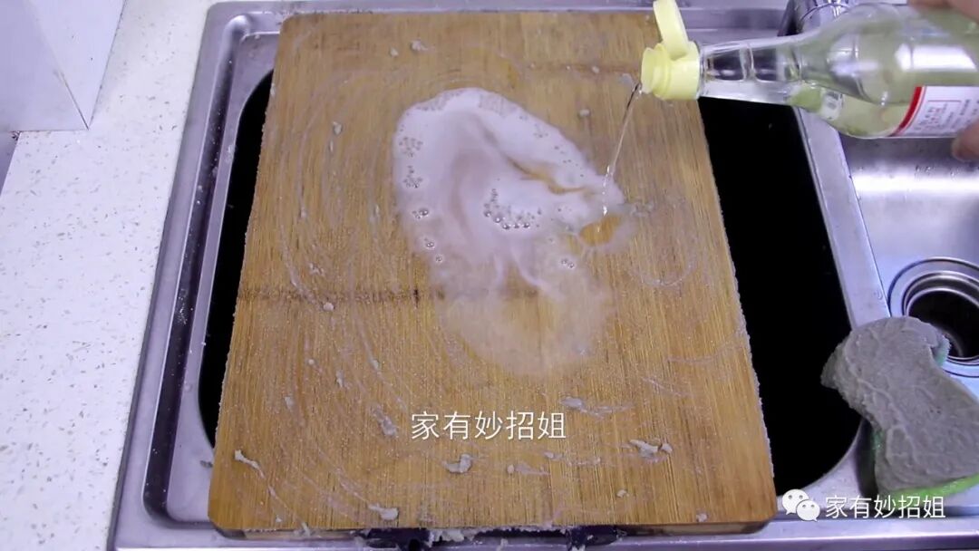 我们往菜板上再倒一点白醋,将白醋均匀的涂抹在菜板上,白醋是酸性的,可以软化菜板表面的一些顽固污渍,也能去除掉菜板上残留的异味。然后我们继续用百洁布把菜板再擦拭一遍。