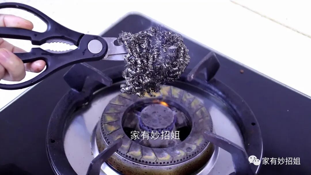 然后再打开燃气灶的小火,把钢丝球放在火上烤一烤。烤的时候钢丝球就会发出滋滋的声音,这是钢丝球上的油渍在融化,我们烤的时候要不停地转动剪刀,使钢丝球的每一面都受热均匀,这样钢丝球里面的油渍就会充分的融化掉了,而且高温还可以将钢丝球里面的细菌杀死。我们烤的时候也不要离得太近,以免将钢丝球烤焦或者是烫到我们的手。