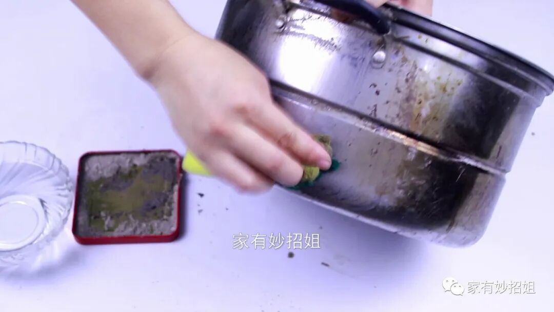 我们先将收集好的蚊香灰装在盒子里,然后再准备一块百洁布和一碗水,先用百洁布放在水中打湿,接着再用百洁布蘸取一点蚊香灰来擦拭。蚊香灰其实就是草木灰,它的粉末非常的细腻。在以前,老一辈的人就会使用草木灰来清洁餐具上残留的污渍,效果非常好。用它来擦拭,就相当于是一种精细的打磨,这样就可以将不锈钢厨具表面的黄渍都擦拭干净了。