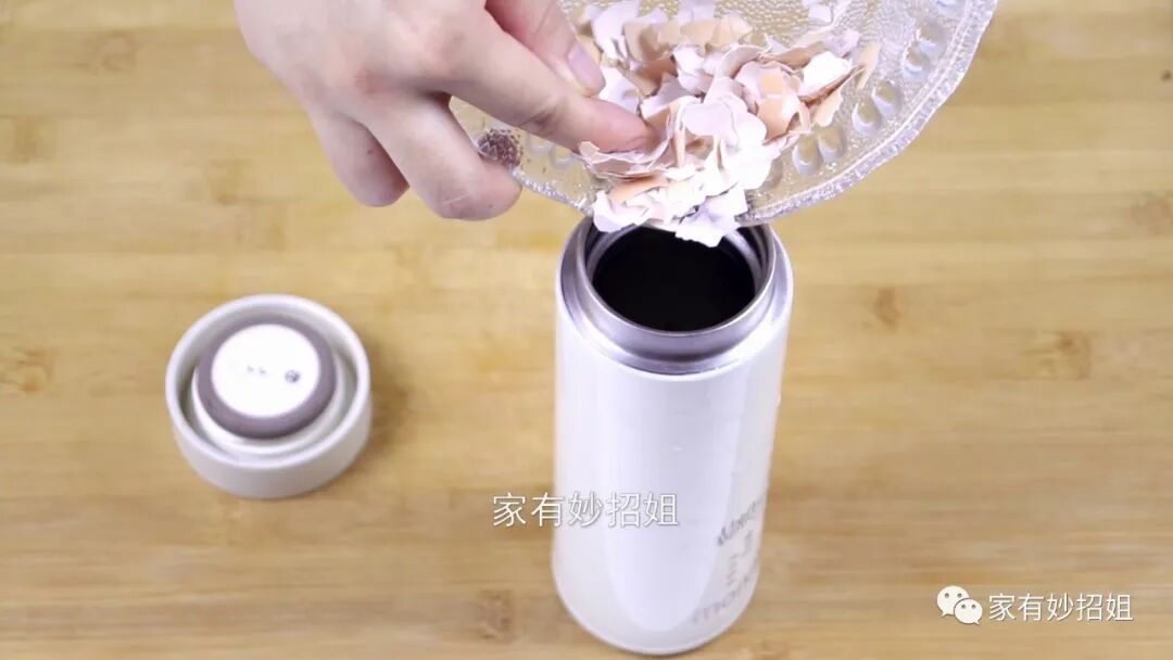 平时我们经常都会用保温杯喝水,但保温杯使用的时间长了,就会在杯底、杯壁上积累水垢。由于保温杯的杯口小,而且还很深,每次清洁起来我们都很难清洁到底部。其实想要清洁到保温杯的底部,我们用鸡蛋壳就可以了。只需要拿上两个鸡蛋壳,然后把鸡蛋壳稍微捏碎一点,再放进保温杯里面,接着再往里面倒入三分之一的开水。