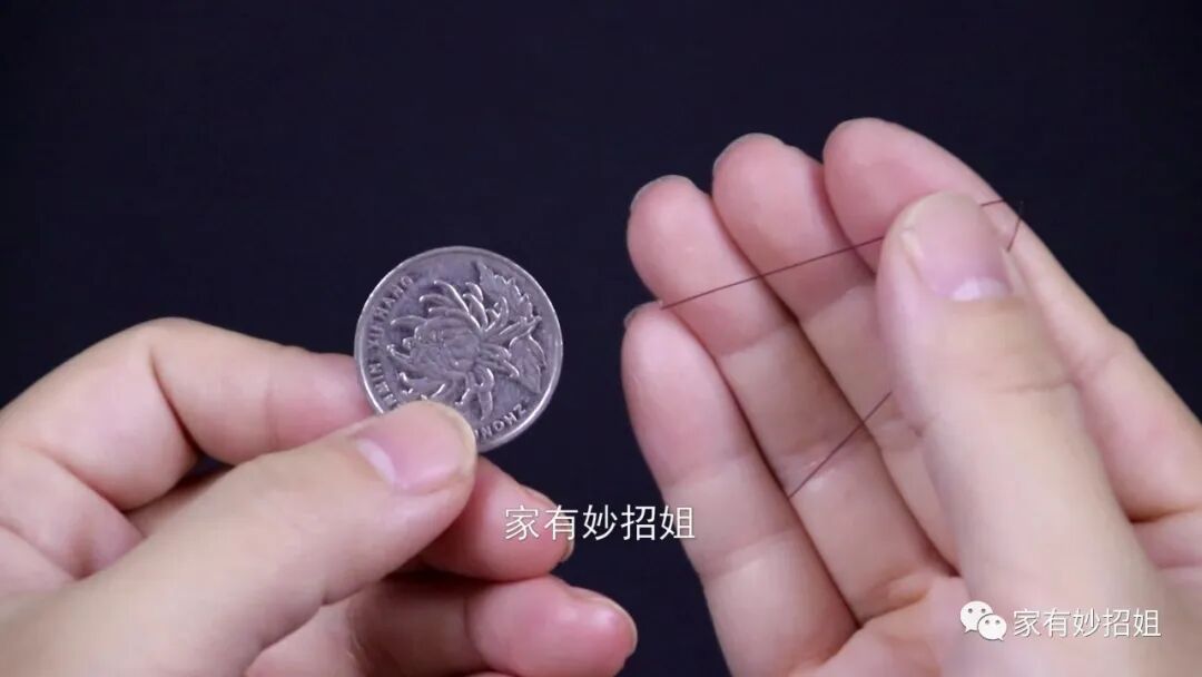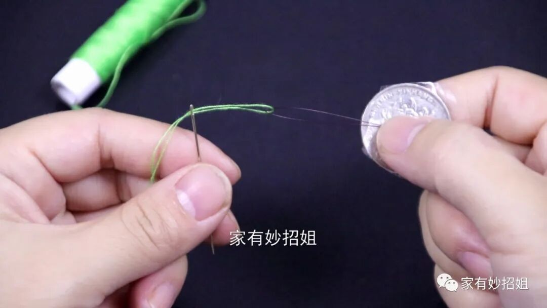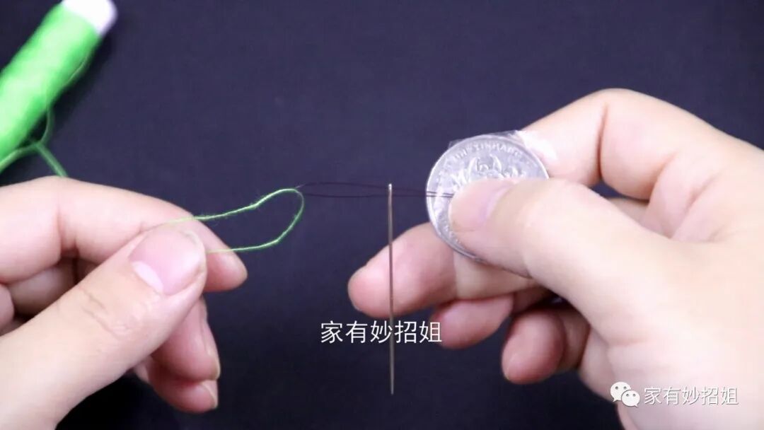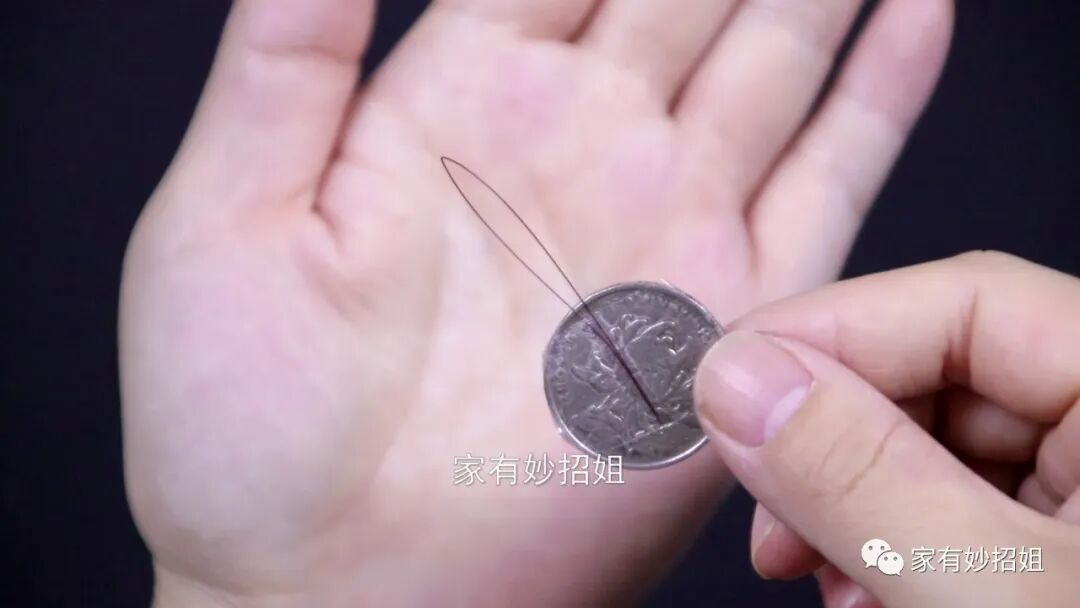 接着再把细丝往回拉,这样就可以把线也带过针眼了,非常的快速。而且这个硬币弄好后,我们把它放在针线盒里,下次要穿针的时候,我们还可以再次的利用起来。