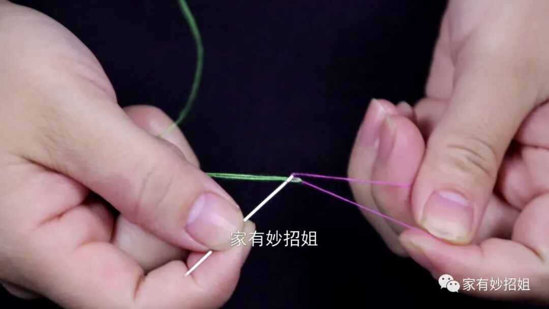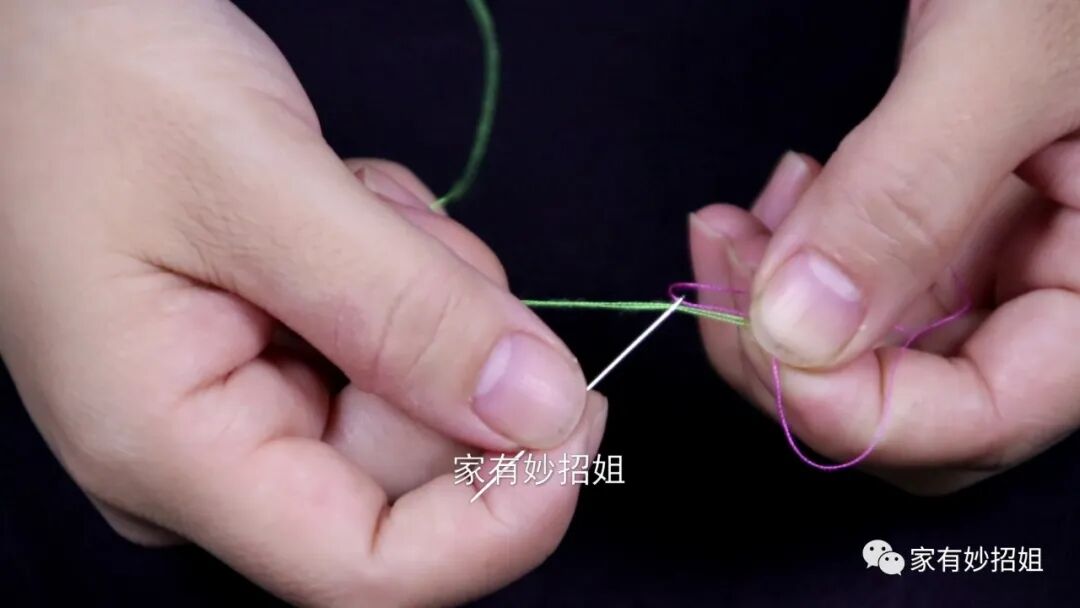 接下来,我们把针拿起来,把新线固定在线头的中间。