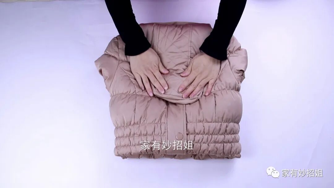 整理好,我们再把衣服的拉链拉好。接下来,我们再把衣服的下半部分往衣服里面折,塞到衣服的内侧,大概折衣服的1/3就可以了。为了避免塞进去的衣服掉落出来,我们可以用针线缝上几针,把它固定住,这样衣服下摆的部分就不会掉落出来了。在衣服袖子的位置,我们也可以缝上几针固定。