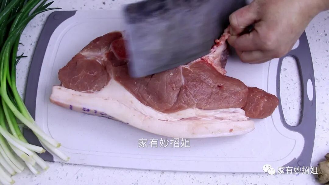 接下来,我们开始来剁肉馅,要是肉有猪皮的话,我们要将猪皮去掉。先将猪肉切成小块的,然后再放入几片生姜和一些葱段和猪肉一起来剁,这样可以使葱姜的味道融合在肉馅里面,使剁出来的肉馅更加鲜美。