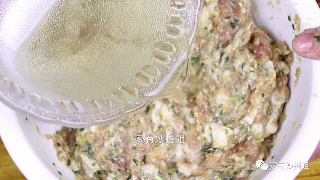 将里面的调料充分的拌匀后,这个时候的花椒水也放凉了,我们往肉馅里加入花椒水,一次不要加得太多,大概两勺的样子就差不多了,然后继续搅拌。等花椒水充分地溶解到肉馅里了,我们再次加入花椒水搅拌。就这样少量多次地添加花椒水,花椒水不仅可以去除肉的腥味,而且调出的肉馅还有花椒的香味。大概加入5~6次花椒水,我们的肉馅就调好了。