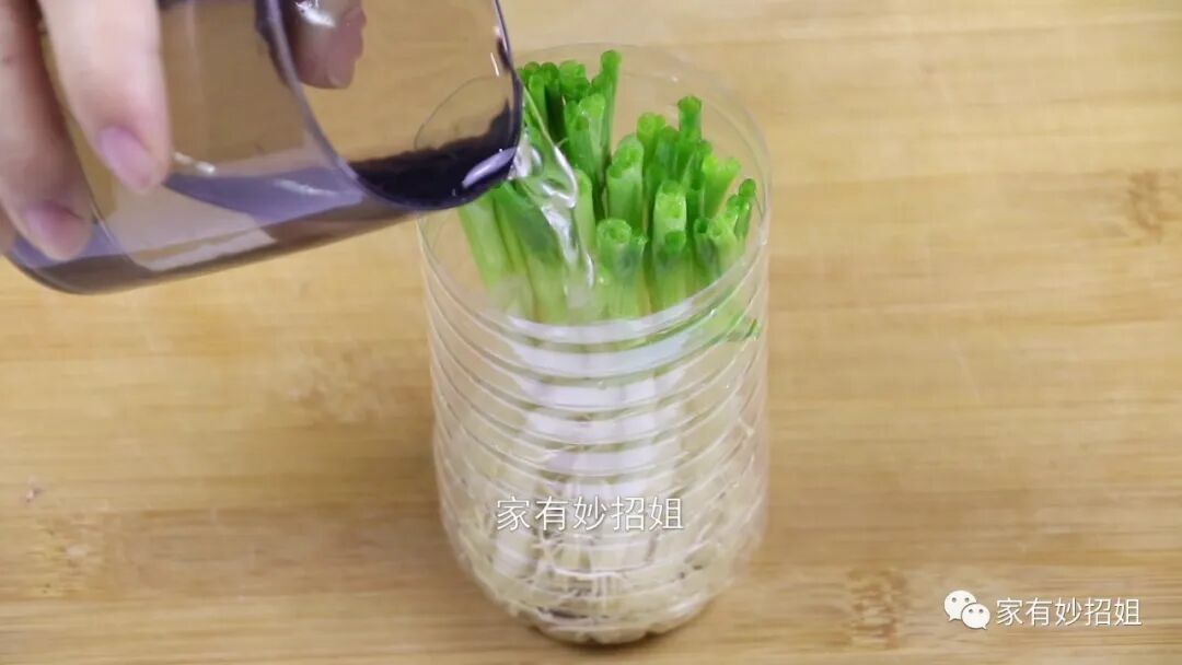 然后再拿一个矿泉水瓶,把瓶子的上半部分剪掉,留下瓶底大概十厘米的样子。接着只需要把香葱直接放进瓶子里面,然后再往里面倒入清水,水量要没过香葱的根部。这样水培的香葱过上两天,它就会长出新的嫩芽。期间我们需要1~2天换一次水,保持水的新鲜,以免时间一长葱根烂掉了。