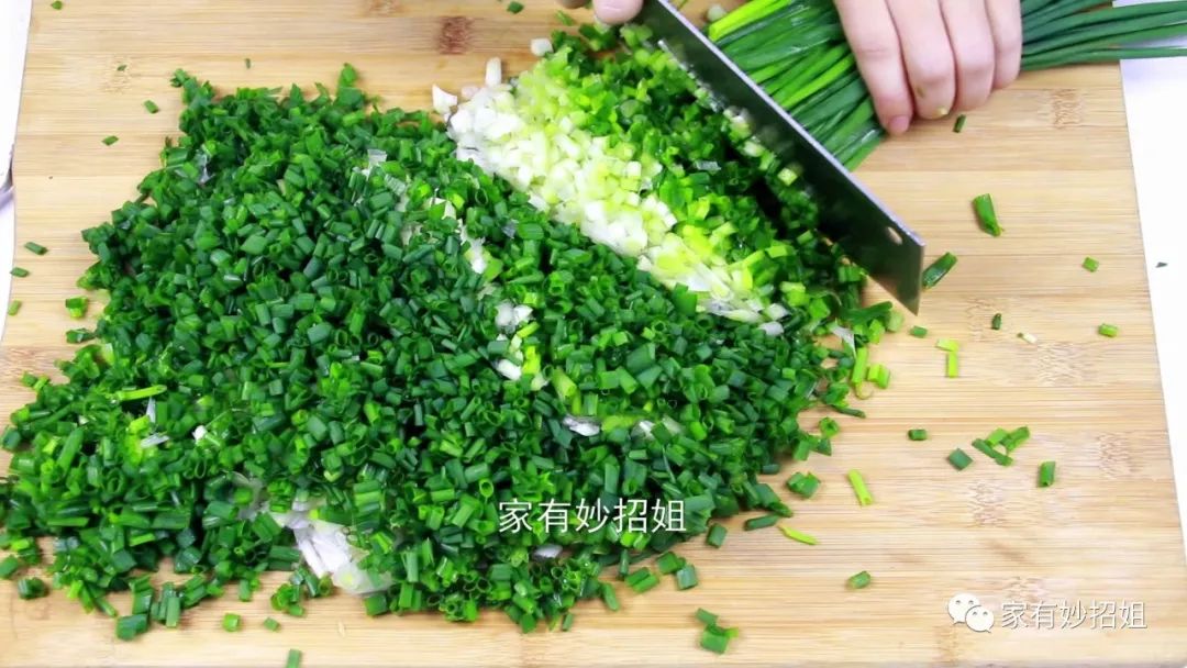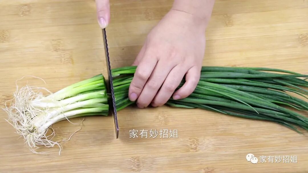 接下来,我们再把晾干水分的香葱切成合适的大小。香葱切起来会有点辣眼睛,我们可以戴上一个口罩再来切,这样就可以避免香葱呛人了。