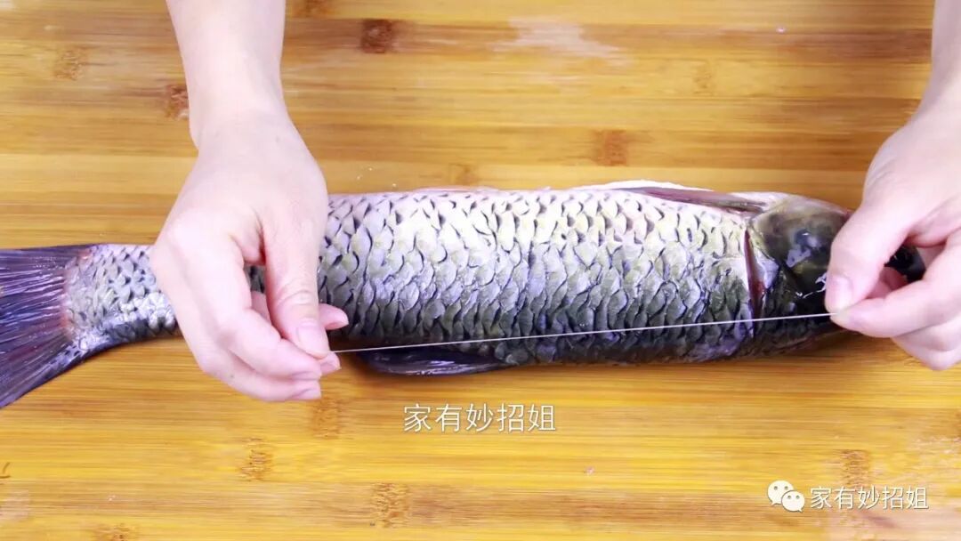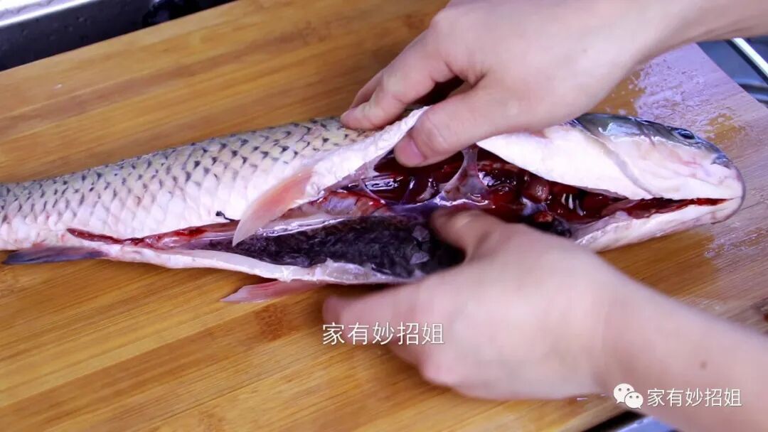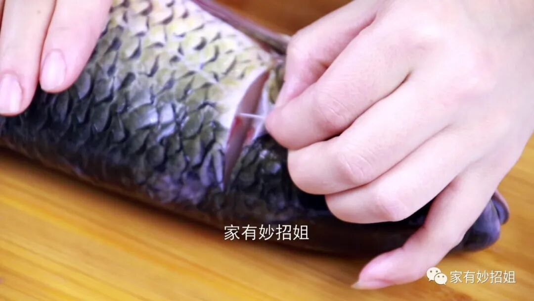 我们在拽的过程中也可以用手轻轻地在鱼身上拍打,这样鱼腥线就能被抽出来了。鱼的另一边,我们也按同样的方法处理一遍,将两根鱼腥线都拽出来,我们的鱼吃起来就不会那么腥了。