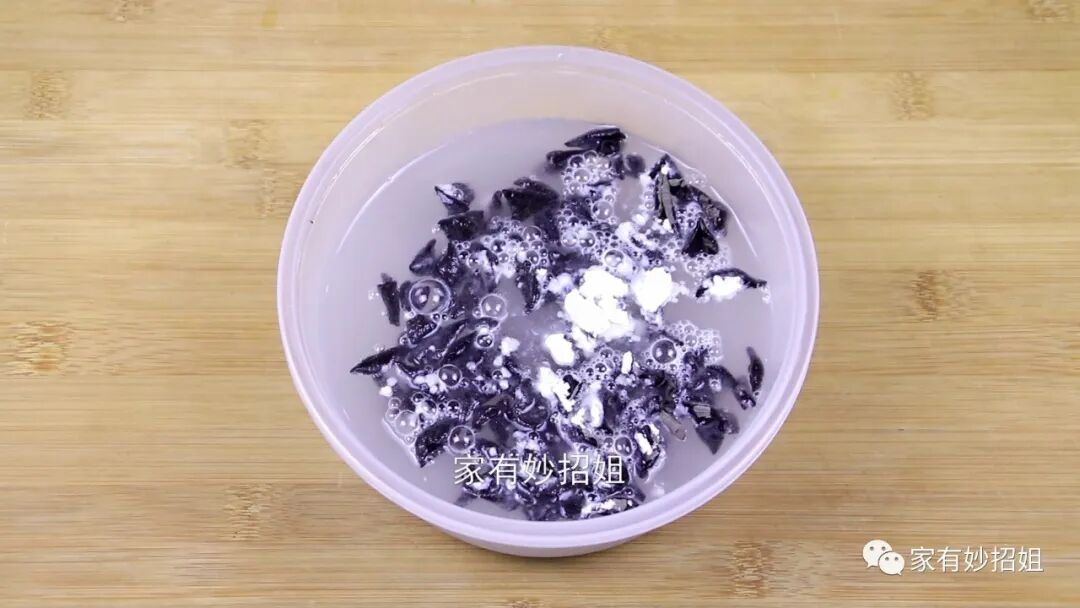 我们快速的摇晃可以增加水分子的运动,使木耳快速的吸水,加入的白糖也可以使黑木耳能更快速的吸水。在木耳的表面会有很多的褶皱,这些褶皱里面很容易隐藏一些细菌污渍,而我们加入的面粉具有很好的吸附作用,可以将木耳表面的杂质都吸附干净。