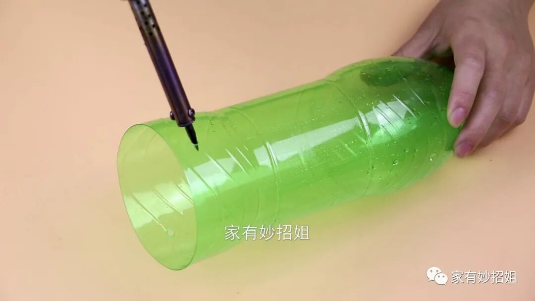 接着,我们在塑料瓶开口下方一点的位置,用电烙铁戳上一个小洞。家里没有电烙铁的,我们也可以用剪刀来戳洞,但是注意不要伤到手了。洞戳好,我们在这个洞对面的位置,同样的也戳上一个小洞。