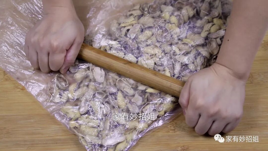 方法也很简单,我们先拿上一个塑料袋,把花生壳放进塑料袋中,然后再拿根擀面杖把花生壳擀一擀,将花生壳擀碎一些。