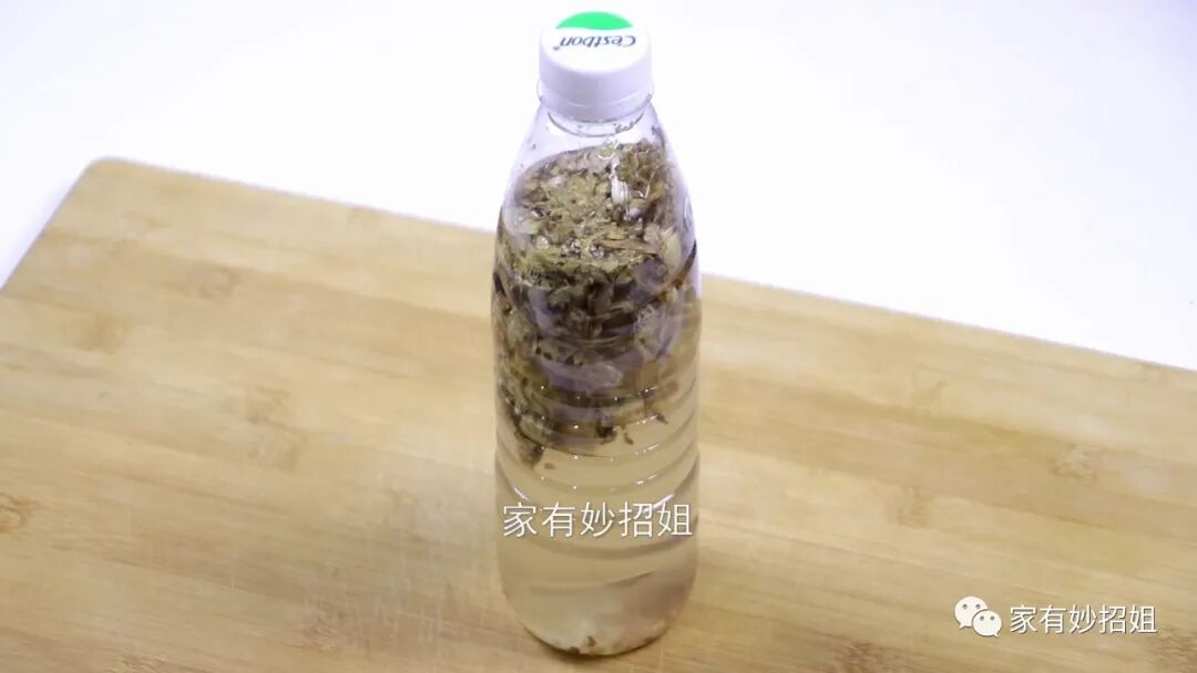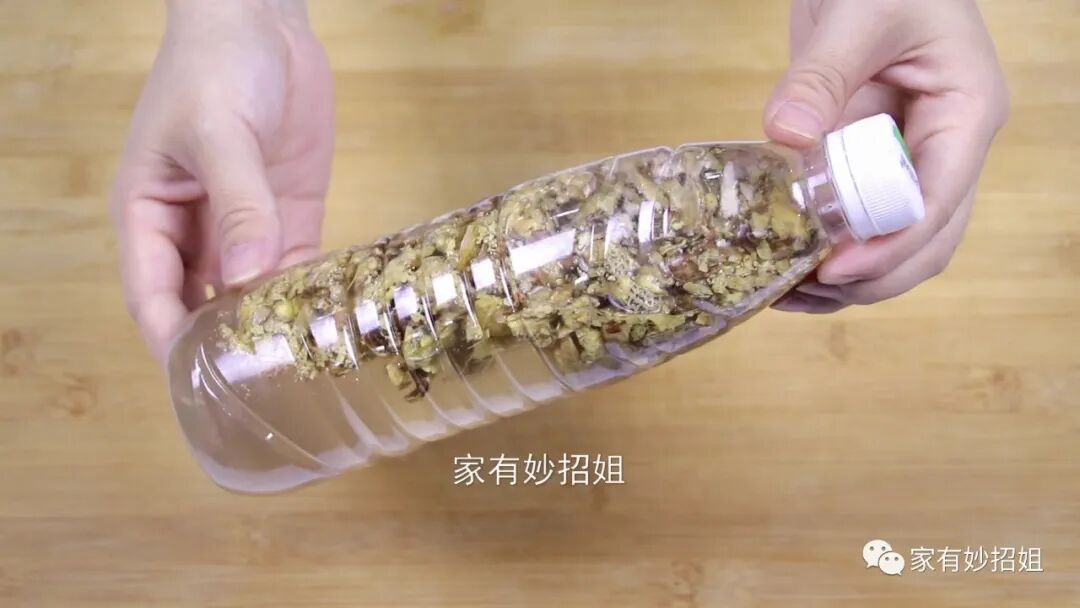 接着我们再拿一个塑料瓶,把擀碎的花生壳都装进瓶子里,然后再往瓶里加入清水,水不需要太多。因为要发酵,如果装太满的话,在发酵的过程中产生的气体,容易使瓶子内的水溢出来。大概装有八分满的水就可以了。接着我们将盖子拧紧,把它放在阴凉的地方,让它发酵上几天。