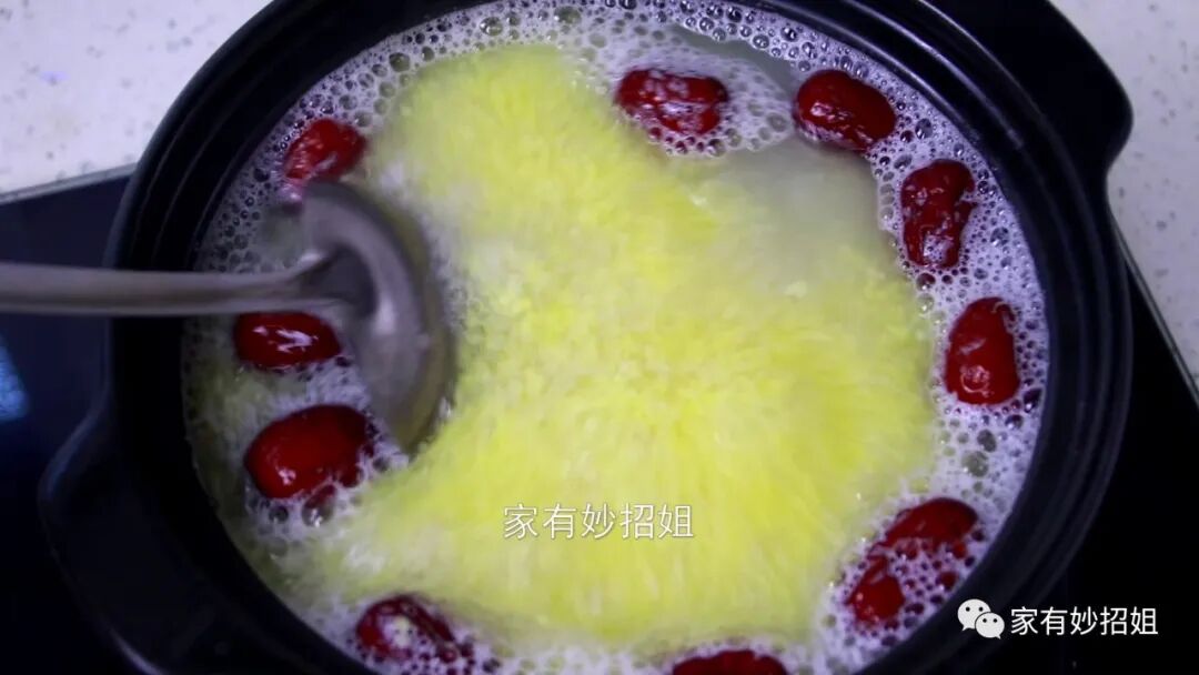 大概熬煮上十分钟左右,我们根据自己的喜好,可以放入一点冰糖和红枣,再继续熬煮。注意,我们煮的时候要边煮边搅拌,防止发生粘锅的情况。