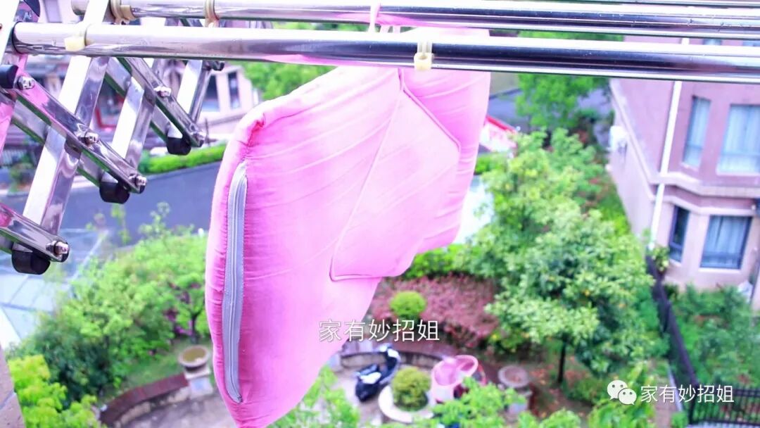 接下来,我们只需要把枕头放在衣架的中间,用两个衣架将枕头夹紧。这样就可以把它放到外面去晾晒了。不仅不影响枕头晒太阳,而且也非常的牢固,不用担心它会掉落。如果今天的文章对您有帮助,那就点一个关注,点一个赞,感谢您的支持。