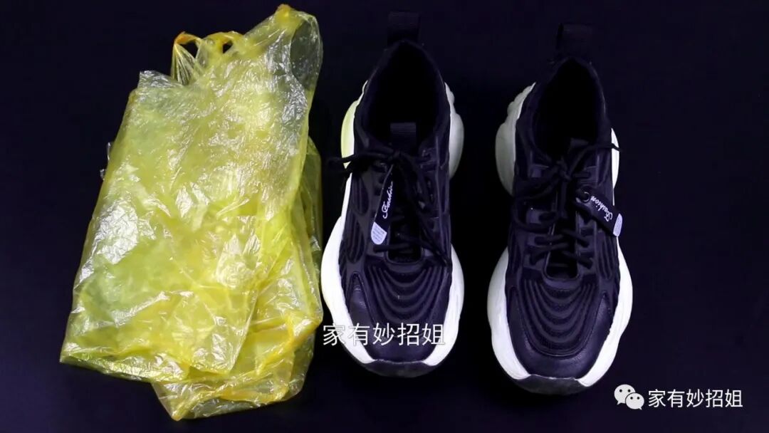 接下来,我们只需将要晾晒的鞋子,穿进塑料袋的两个提手里面,鞋子的底部朝上,这样我们再拿去晾晒的时候,鞋子里面的水分都可以顺势流出来,我们的鞋子里就不会再有积水了,这样把它放到太阳下晾晒就能干的更快一些。