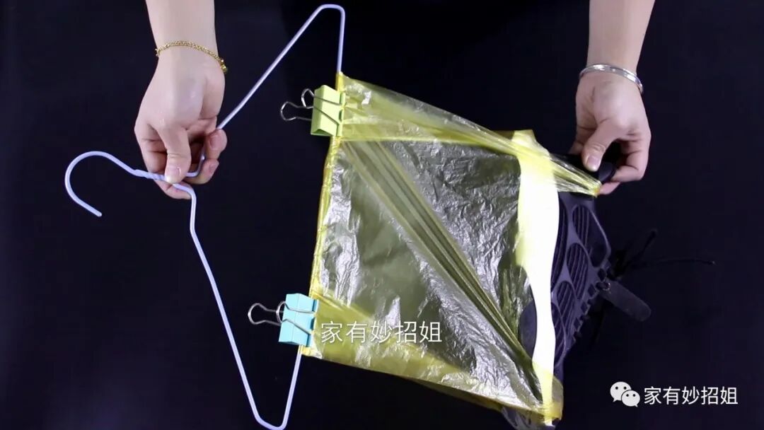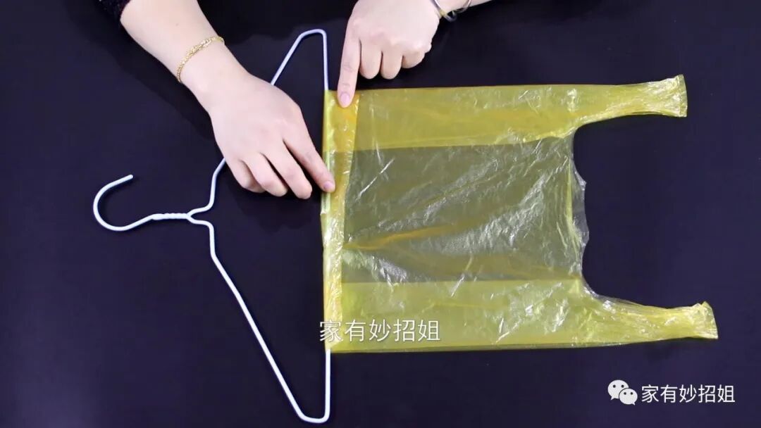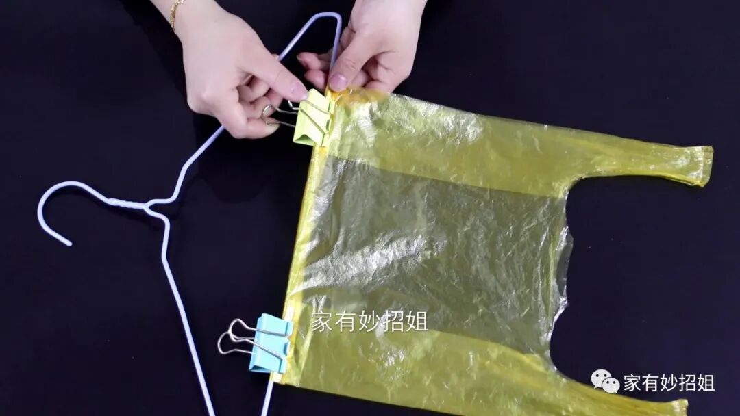 折叠好,我们再用燕尾夹夹在袋子的两边,把塑料袋固定在衣架上面,这样就完成了,塑料袋被牢牢的固定在衣架上了。