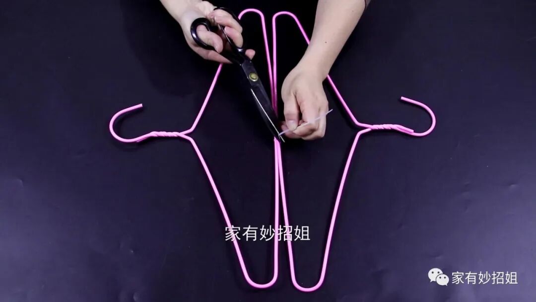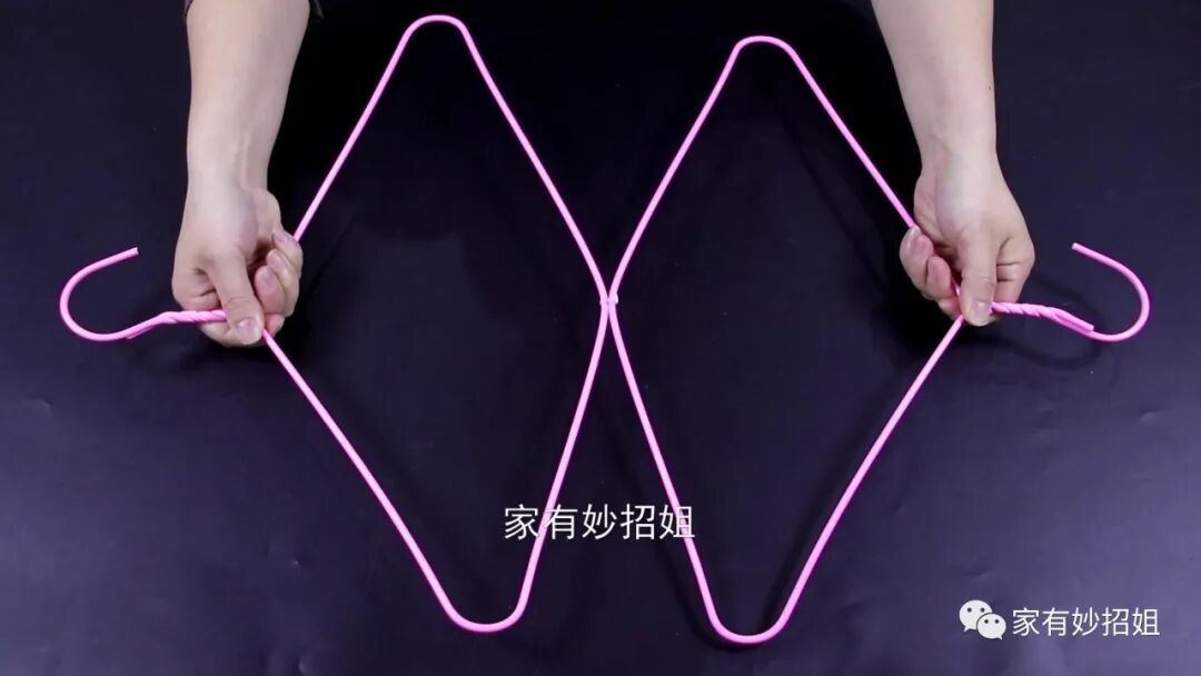 接着,我们在两只手分别抓住两个衣架的挂钩,向两边拉扯。这样两个衣架就变成了一个菱形。