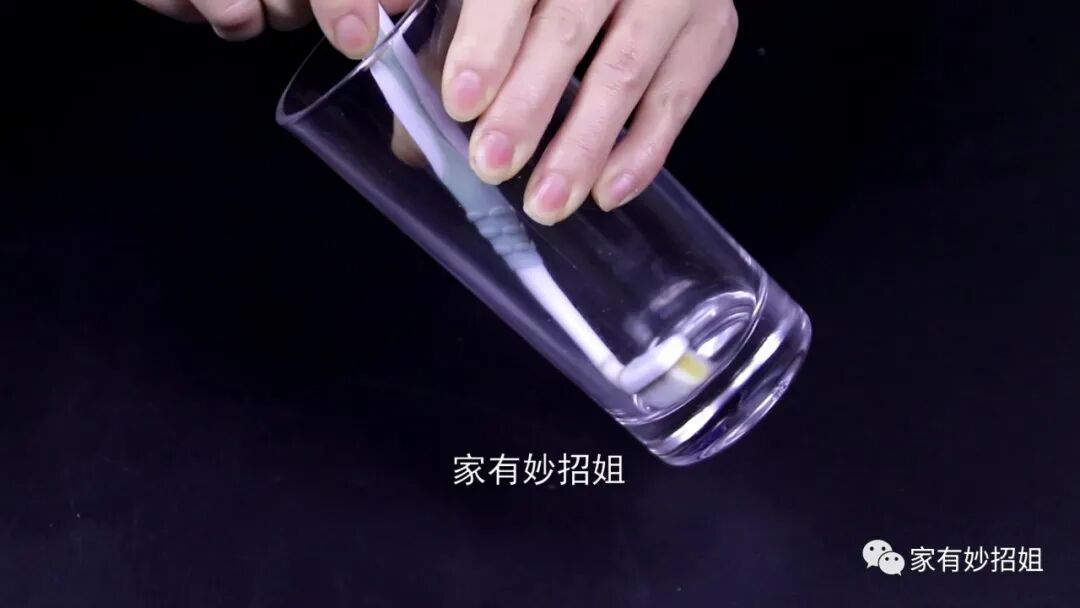 我们只需要把牙刷伸入到杯子里面,这样刷毛的部分就可以很好的清洁到杯子的底部了。