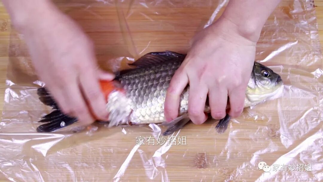 接下来,我们就可以利用上这个萝卜头来刮鱼鳞了。我们先一只手固定住鱼,另一只手抓住胡萝卜头,把胡萝卜尖头的位置从鱼尾处向上推,在推的过程中,鱼鳞就大块大块的掉落了。不需要费多大劲,就能轻松将鱼鳞刮下来,而且刮下的鱼鳞还不会到处飞,全部掉在了我们垫好的保鲜膜上。