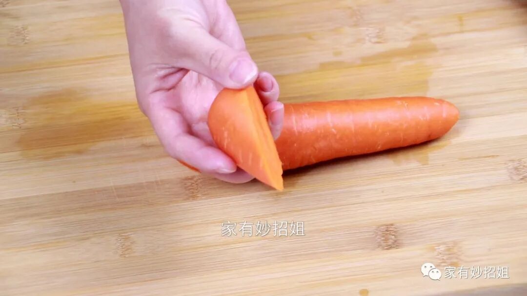 接着我们准备一个胡萝卜,把胡萝卜的头部斜着切一刀。只需要用到这个萝卜头就可以了,剩下的萝卜我们就可以用来炒菜,也不会造成浪费。