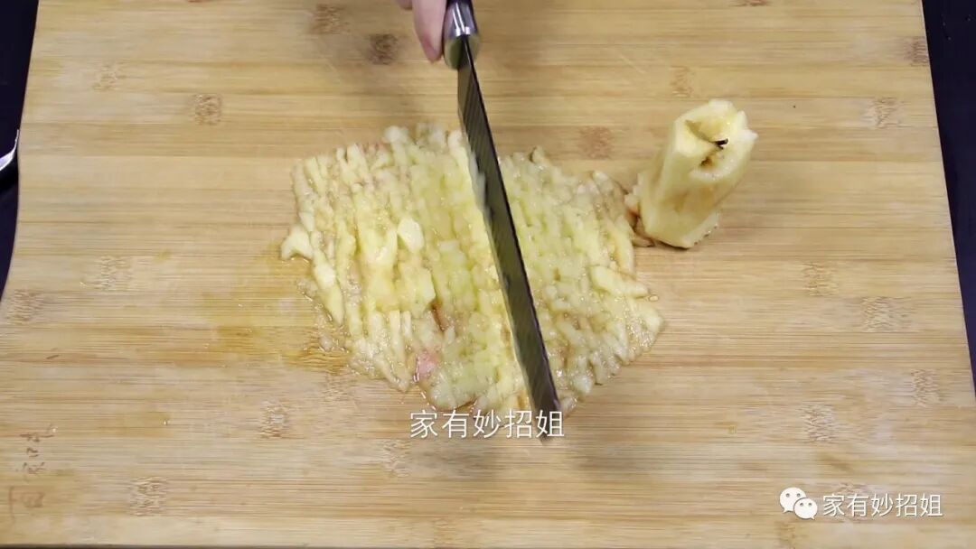 苹果烂掉之后,我们先将苹果腐烂的地方切掉一点,然后把剩下的苹果切成片,最后再切成碎末。