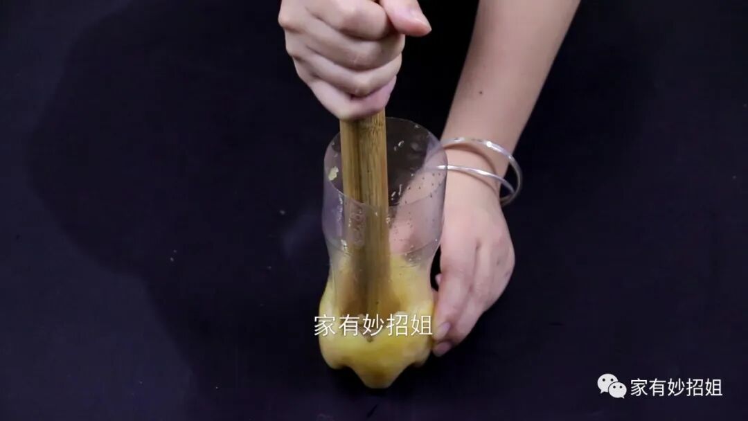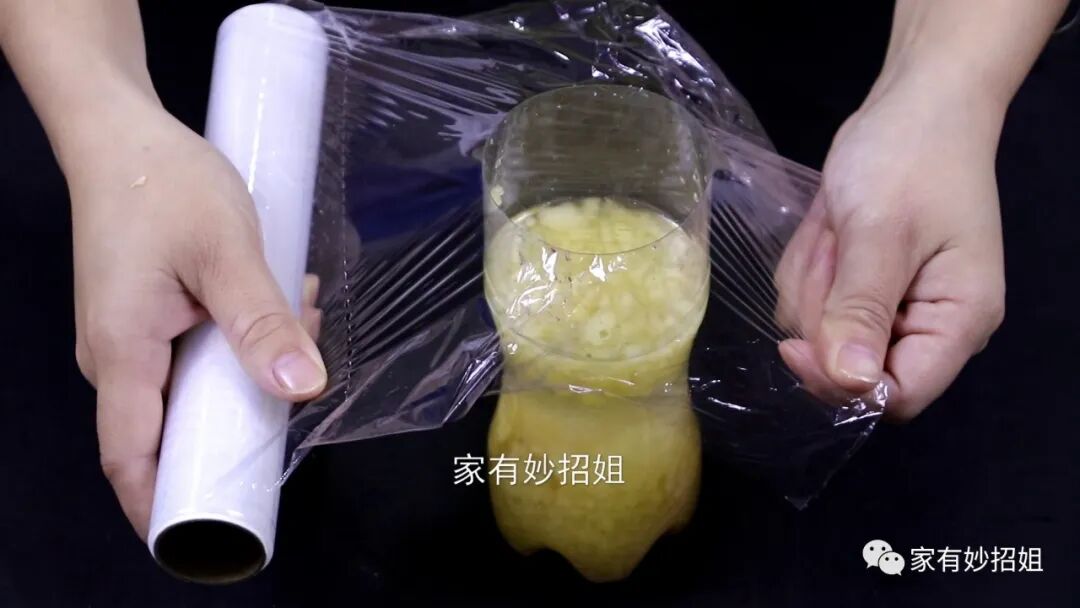 碾压好,我们在里面倒入一点清水,水也不要装得太满了,因为还要发酵,装得太满的话,在发酵的过程中产生的气体就会溢出来。最后,我们再用保鲜膜将塑料瓶的盖子盖好,然后放在阴凉通风的地方发酵上一个星期。