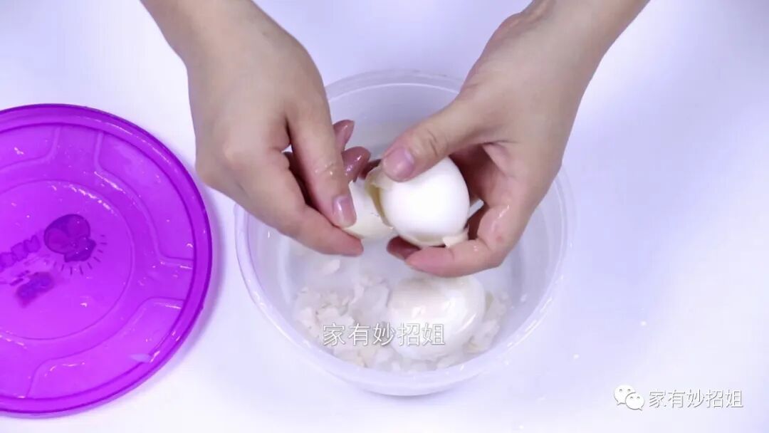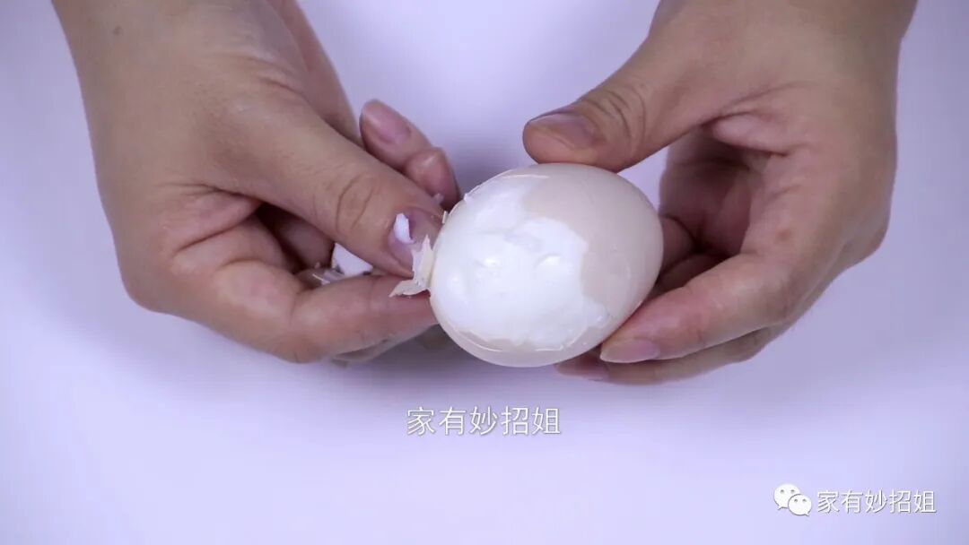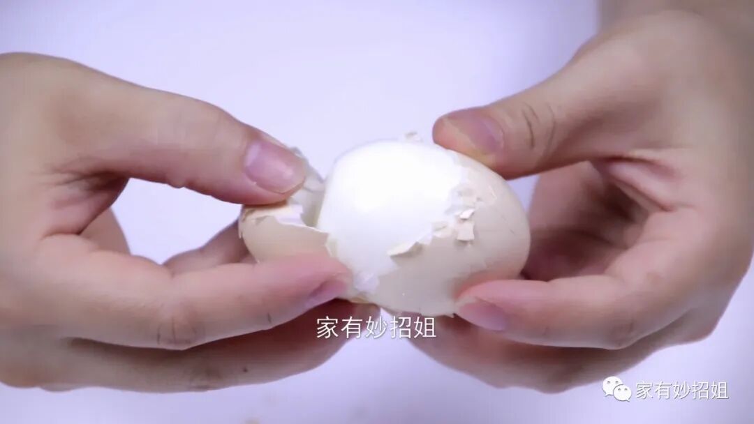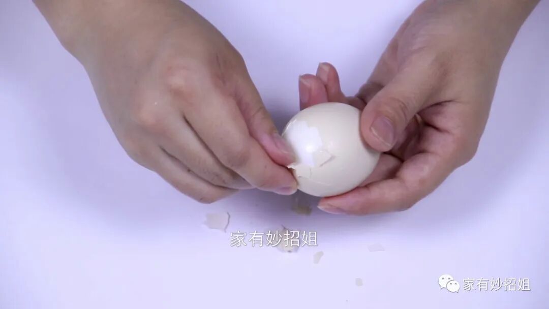 接下来,我们只需要把鸡蛋中间一圈的鸡蛋壳剥掉。然后一手抓着一边的鸡蛋壳,再往两边掰,这样一个鸡蛋就被剥出来了,方法简单快速,而且剥出来的鸡蛋也是完整的。