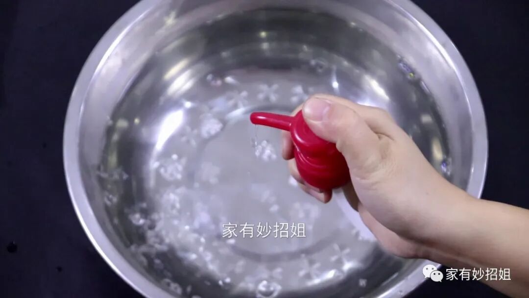 我们准备一盆清水,然后把压嘴竖着放在水里,接着不停的按压,将压嘴管子里的洗洁精按压出来。