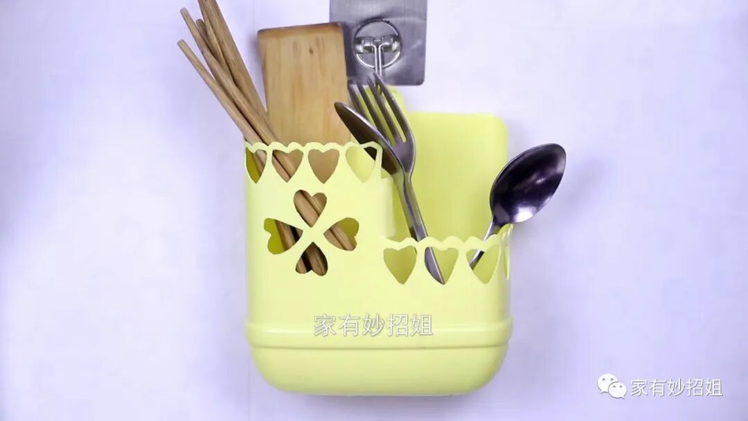 我们可以在厨房的墙壁上粘一个挂钩,然后把改造好的洗洁精瓶挂在上面,可以用来放一些筷子、勺子之类的,收纳沥水两不误,还非常的美观。