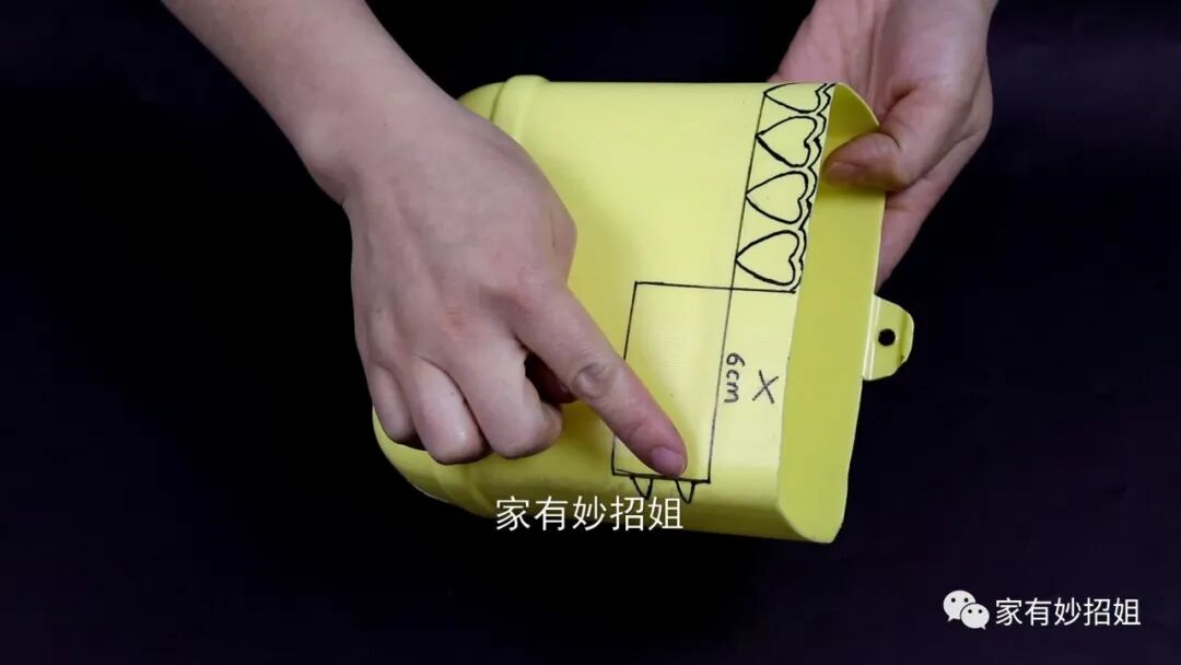 切割好,我们只需要用到瓶子的下半部分,上半部分先放在一边。接下来我们再将下半部分的一边标记出一些图案,我标记的是几颗心形,大家可以根据自己的喜好,标记花型、五角型都是可以的。在另外一边预留一个6cm的样子,然后以这6cm为边,标记出一个长方形。在长方形靠近瓶边的位置,再标记两个小的三角形。画好,我们再沿标记线切割下来。